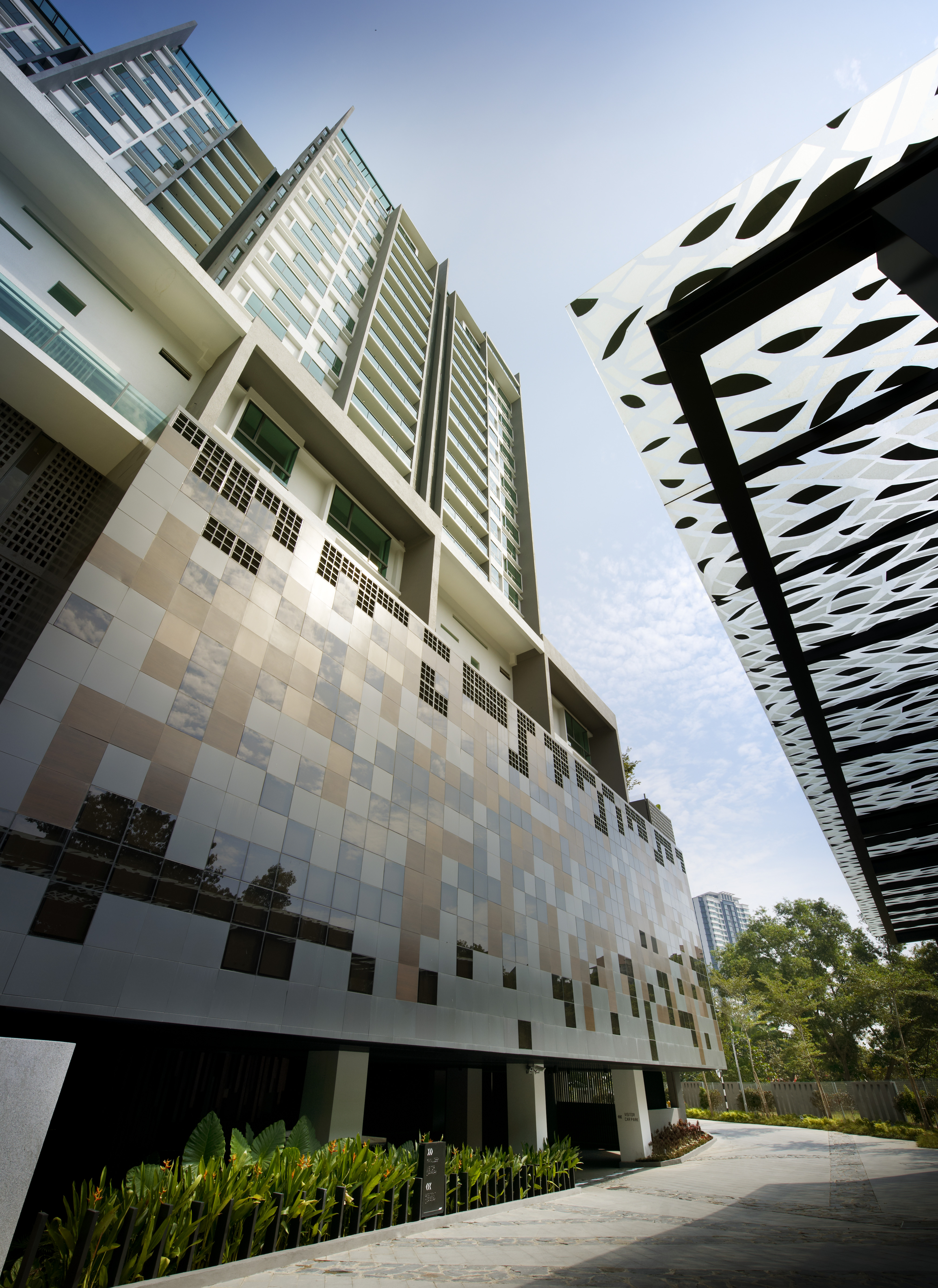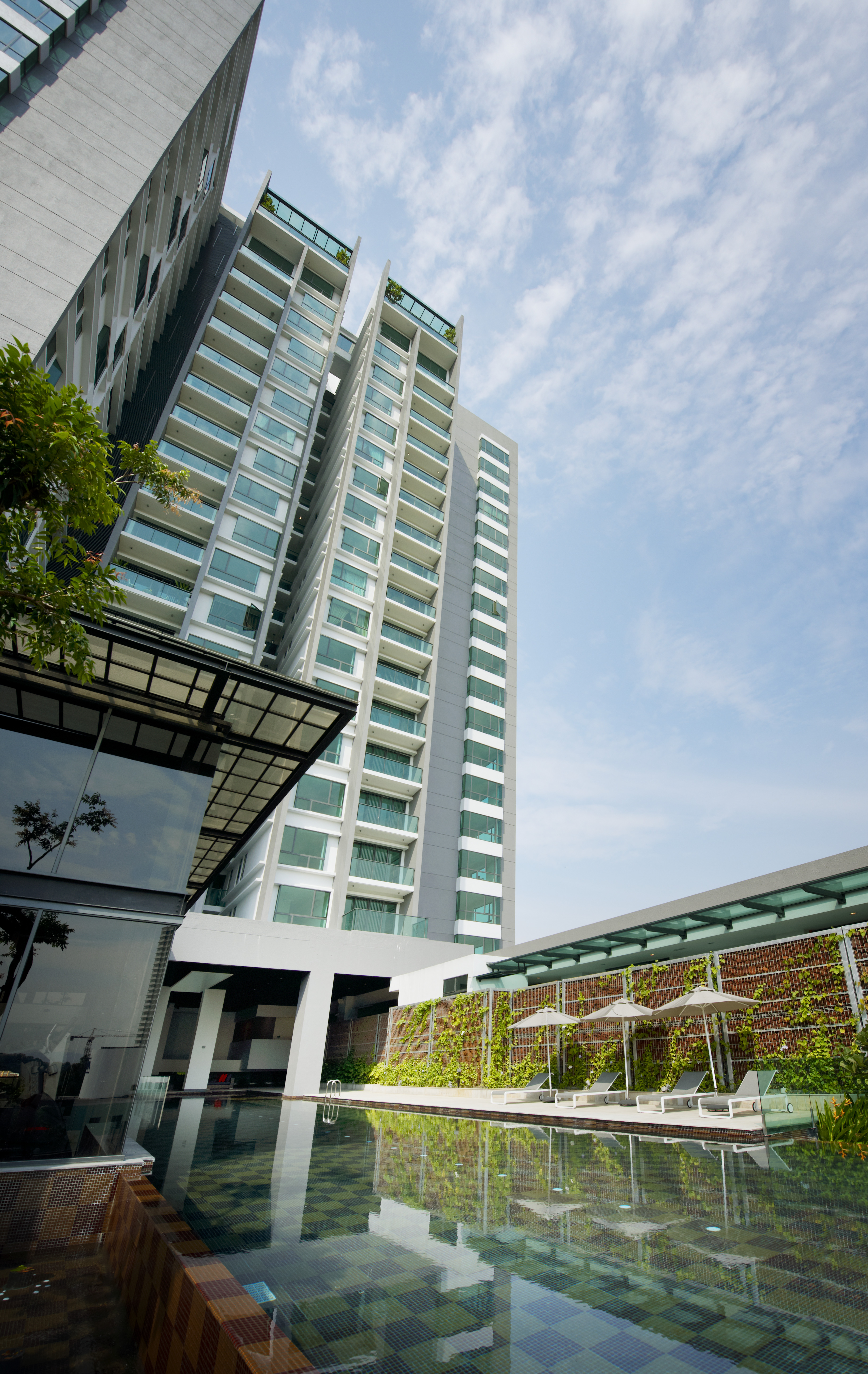 Treez is a residential project that contains an interesting mix of condominium apartments, garden villas and penthouse lofts. It draws ideas of design from a tree, in which staggered windows are translated from an alternating series of branches to capture and frame views of the surrounding context.